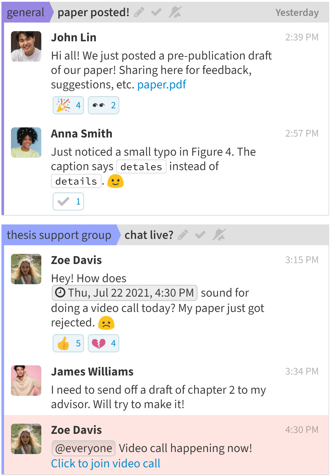 For more than a year, Zulip has been the cornerstone of our online Category Theory community. We greatly appreciate the seamless integration of Latex in every message as well as being able to get sidetracked (which, let's face it, happens a lot with mathematicians) without compromising an entire conversation: we can simply create a new topic for every tangent! Moreover, the flexible streams-and-topics system greatly helps us navigate through the constant influx of messages, as it is simple to tell if a message is relevant to one's interests.